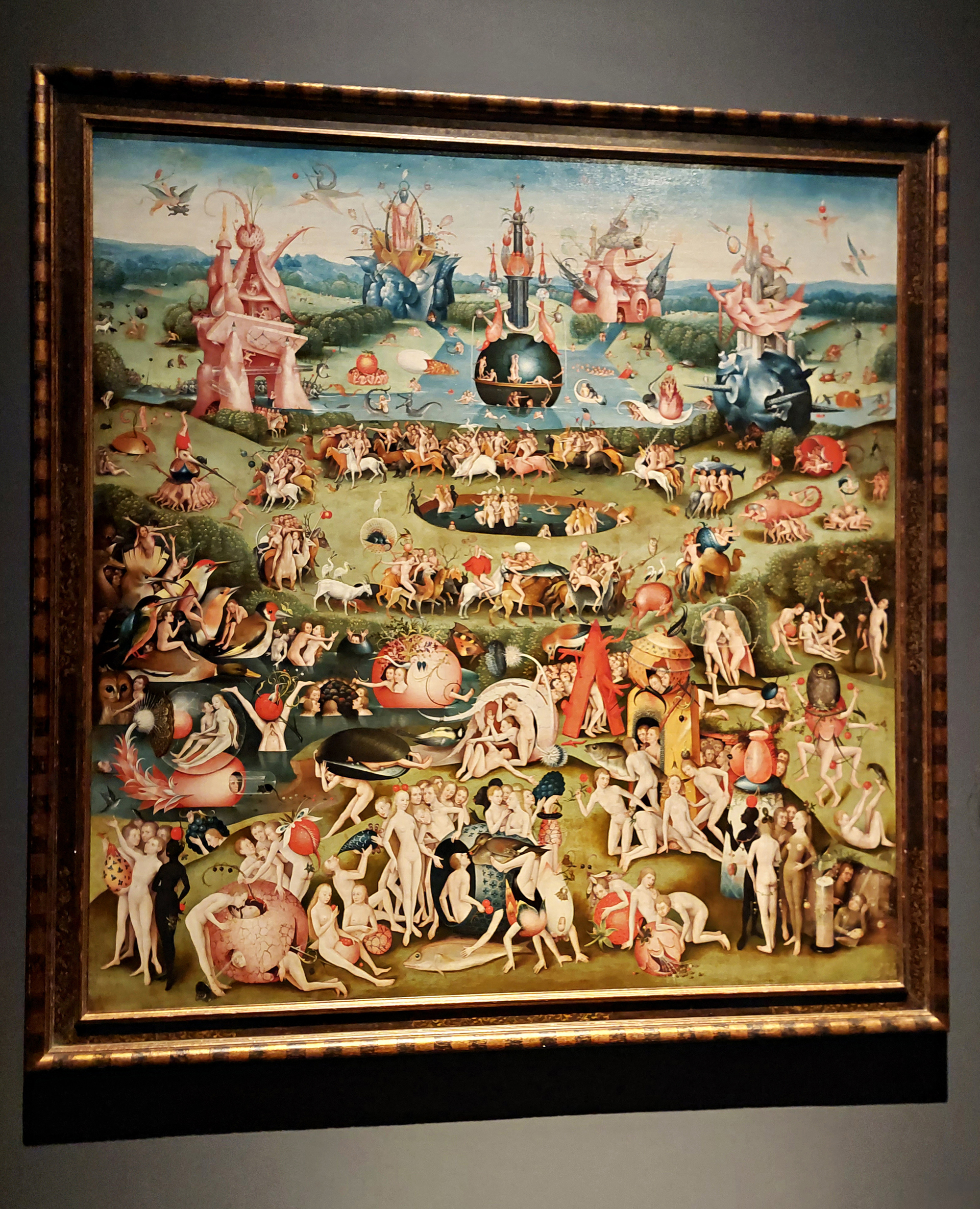 Hieronim Bosch (naśladowca) „Ogród rozkoszy ziemskich” (“The Garden of Earthly Delights”), olej na desce, 1550-1560. Wystawa “Between Paradise and Hell: The Enigmatic World of Hieronymus Bosch” Muzeum Sztuk Pięknych (Szépművészeti Múzeum). Budapeszt 2022