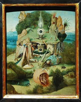 Hieronim Bosch (naśladowca) „Rajski krajobraz” (“Paradisical Landscape”), olej na desce, 1539. Wystawa “Between Paradise and Hell: The Enigmatic World of Hieronymus Bosch”, Muzeum Sztuk Pięknych (Szépművészeti Múzeum). Budapeszt 2022