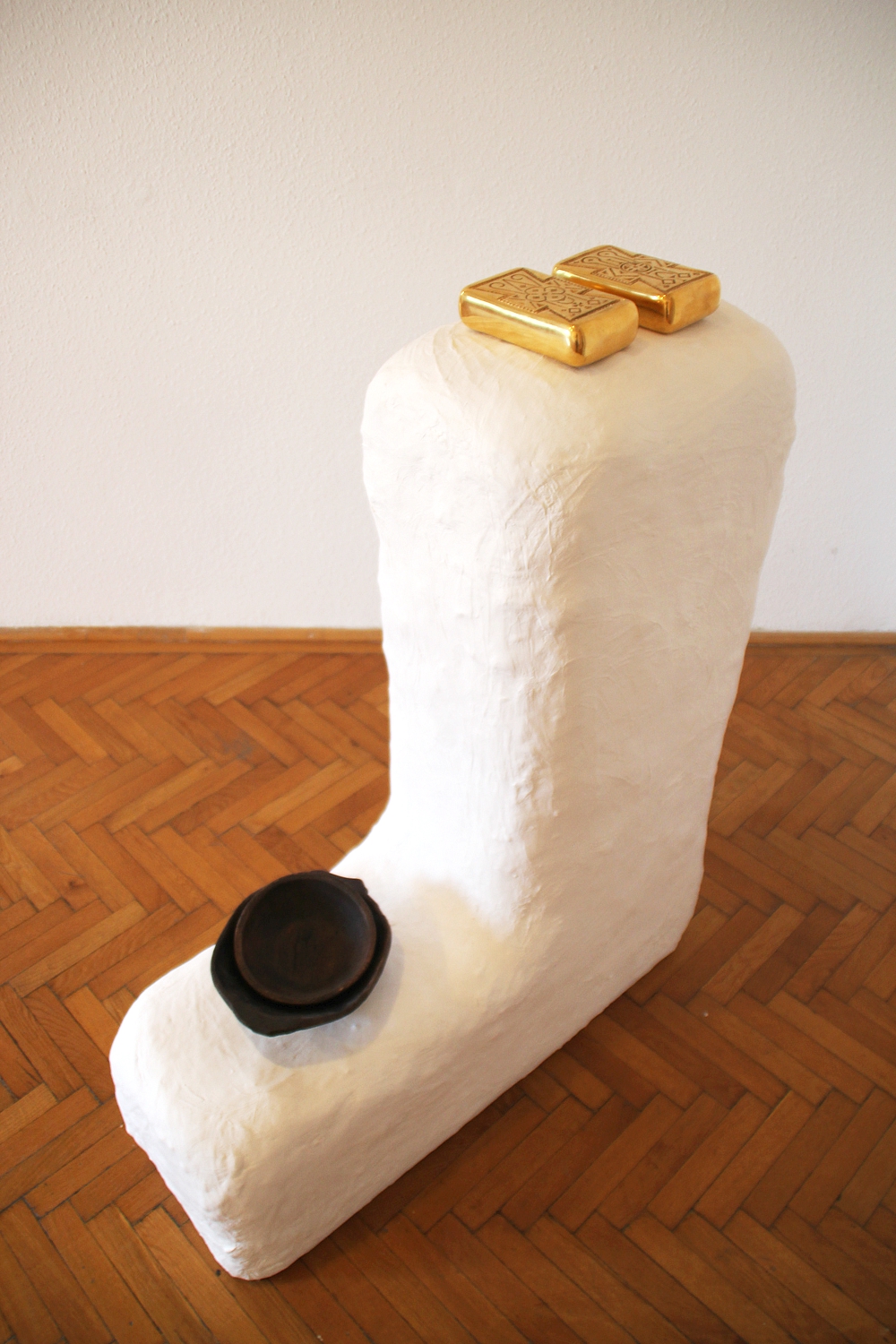 The stove in the traditional Romanian houses used to have multiple functions: people cooked on it, dried clothes or cheese above it, slept on it during winters, etc. Its form made me think of Zaha Hadid’s organic living spaces, those one-piece furniture made out of single pieces of material molded so as to correspond to each object: chair, table, bed, ceiling. The wood plates are bought from an antiques fair in Bucharest. The two pieces of stamped cheese stamped with archaic motifs and signs are cast in bronze and gilded. For me, as a child during communist times, the golden corn ears will always remain part of the symbols on the coat of arms of the Socialist Republic of Romania. / Ioana Nemes /