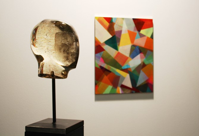 Oliver Czarnetta „Spektrum”, rzeźba, żywica, ok. 28 cm, 2015; w tle Bim Koehler „KE – 49.08”, pigmenty na drewnie, 49×39 cm, 2014. Galerie Schmalfuss (Art Market Budapest). Budapeszt 2015