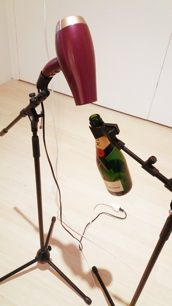 Sarah Schönfeld “I Can’t Get No Satisfaction (Sirens)”, dwa stojaki mikrofonowe, suszarka, butelka, wosk pszczeli, czujnik ruchu, 2015. Wystawa “Passion: Fan Behaviour and Art”, Ludwig Múzeum. Budapeszt 2016