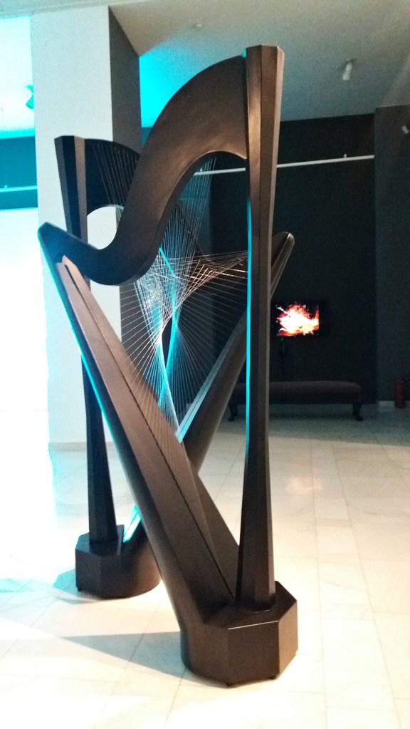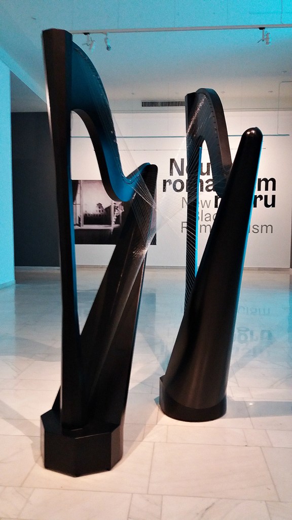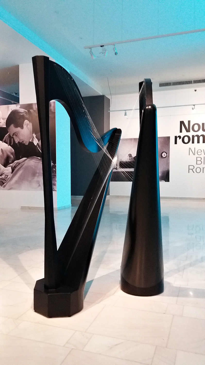Alexandra Baumgartner „2 harfy” (“2 Harps”), drewno, werniks, struny, 2016. Wystawa “Noul romantism negru / New Black Romanticism”, The National Museum of Art of Romania. Bukareszt 2017