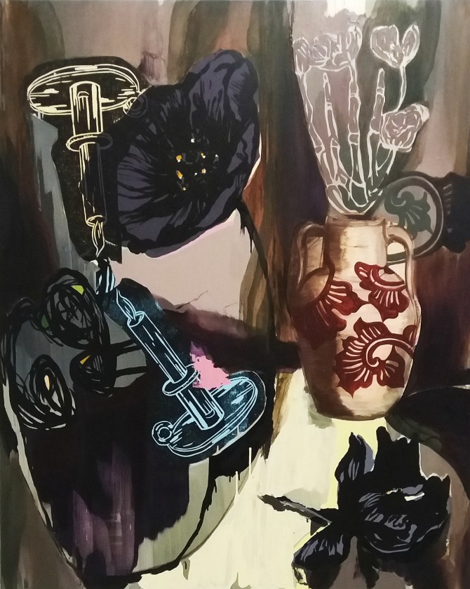Obrazy w tle: Adam Saks „Pazur” („Claw”), 2015-2016 i „Kwiecie” (Blossom”), 2014; olej na płótnie.
