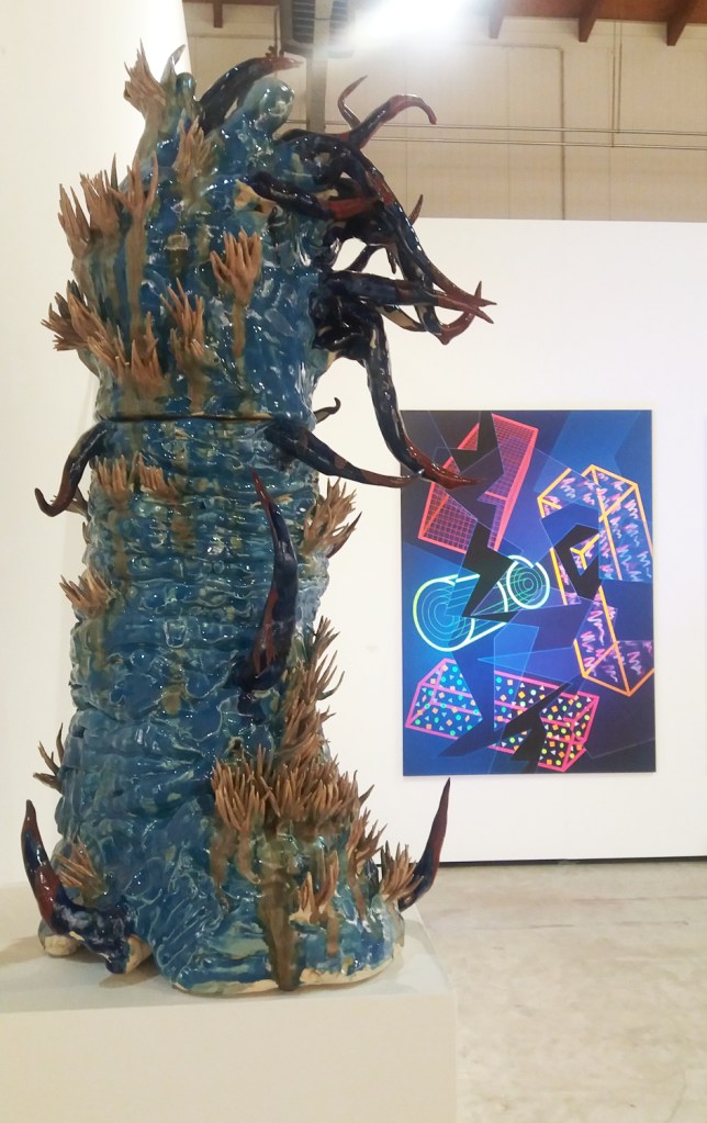 Mira Dalma Makai „Column (Pipes and Stones)”, ceramika, 2016; w tle András Mengyán „Information fragment”, 200×140 cm, 1992. Art+Text Budapest (Vienna Contemporary). Wiedeń 2017