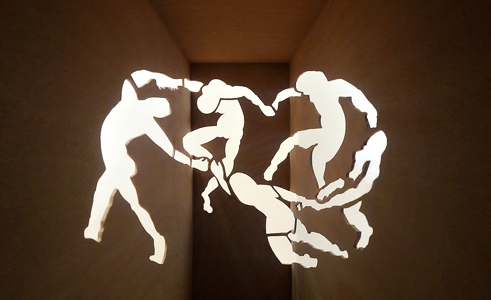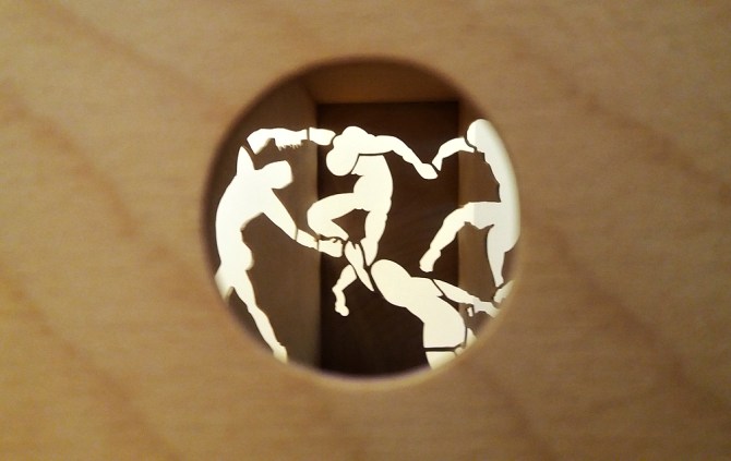 Tamás Szvet „Studium przypadku – Estetyka”: skrzynia z ręcznie wyciętymi, pozornie abstrakcyjnymi kształtami, które układają się w „Taniec” Matisse’a, gdy widz zajrzy do środka przez mały otwór z boku. W tle Miklós Gaál: fotografia z cyklu „The Big Picture”.