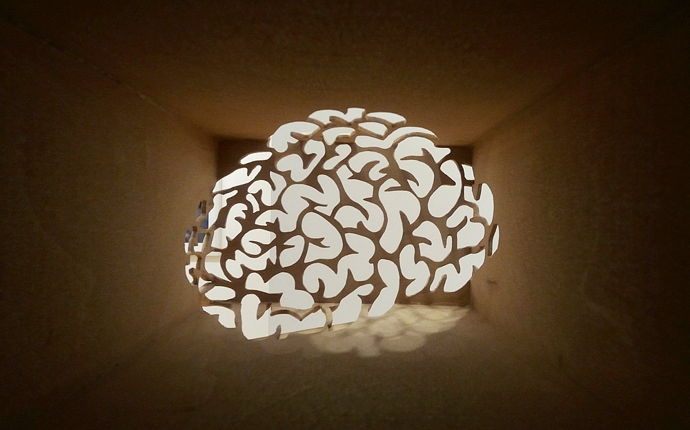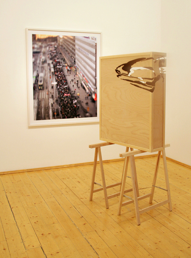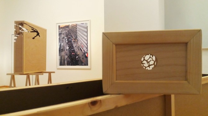 „I created wooden boxes similar to those that museums use to transfer artworks in order to save them. The boxes are closed and only a small hole let us observe the content. The works are using anamorphosis techniques. Different images become visible through the perspective based optical illusion. I created spaces in the boxes by cutting the wood, so thus the image is appear in one angle. The interviews and the opinions are fill them, so the whole installation is focus of contemporary art questions by exchanging ideas and point of views”. (Tamás Szvet )