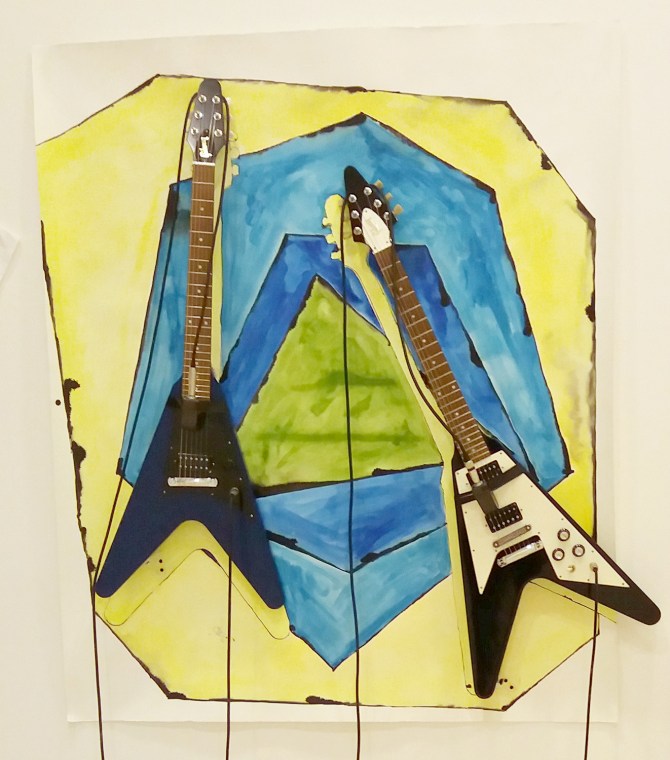 Catherine Lorent „Relegation: Element de Conspiration, Guitar Constellation”, 150 × 130 cm, ink on paper, 2 Gibson Flying V, E-bow, amplifier, 2013. “Passion: Fan Behaviour and Art”, Ludwig Múzeum. Budapest 2016