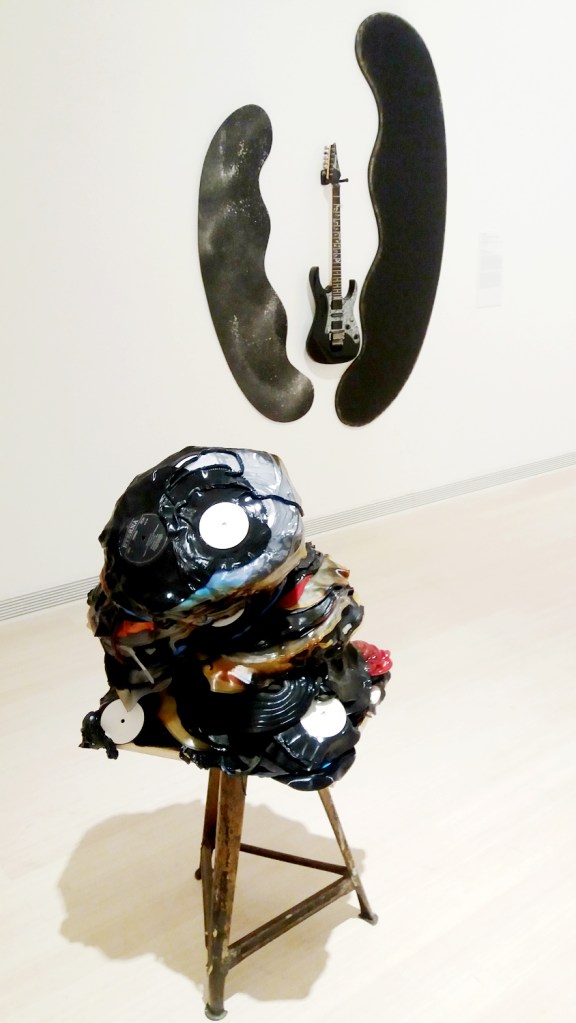 Moritz Götze “Dedicated to the One I Love”, 110x40x50 cm, vinyl sculpture, 2015; Helmut Kirsch “Double Monkeygrip”, 180×148 cm, fibre board, 1996/2015. “Passion: Fan Behaviour and Art”, Ludwig Múzeum. Budapest 2016