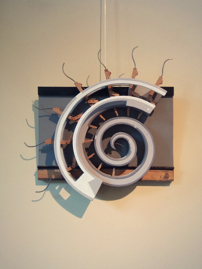 Márton Barabás „Spirala”, malowane drewno, fragmenty instrumentu. Wystawa „Gardens In Towns”, Pesti Vigadó. Budapeszt 2018