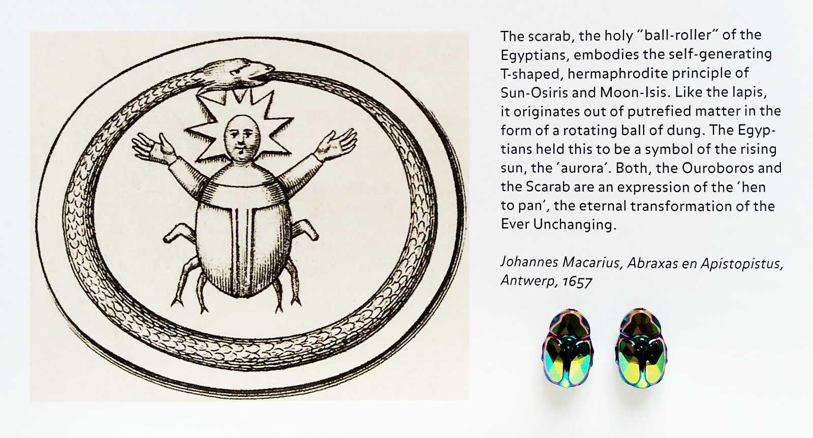 „My example concerns a young woman patient who, in spite of efforts made on both sides, proved to be psychologically inaccessible. The difficulty lay in the fact that she always knew better about everything. Her excellent education had provided her with a weapon ideally suited to this purpose, namely a highly polished Cartesian rationalism with an impeccably ‚geometrical’ idea of reality. After several fruitless attempts to sweeten her rationalism with a somewhat more human understanding, I had to confine myself to the hope that something unexpected and irrational would turn up, something that would burst the intellectual retort into which she had sealed herself. Well, I was sitting opposite her one day, with my back to the window, listening to her flow of rhetoric. She had an impressive dream the night before, in which someone had given her a golden scarab — a costly piece of jewellery. While she was still telling me this dream, I heard something behind me gently tapping on the window. I turned round and saw that it was a fairly large flying insect that was knocking against the window-pane from outside in the obvious effort to get into the dark room. This seemed to me very strange. I opened the window immediately and caught the insect in the air as it flew in. It was a scarabaeid beetle, or common rose-chafer (Cetonia aurata), whose gold-green colour most nearly resembles that of a golden scarab. I handed the beetle to my patient with the words, ‚Here is your scarab.’ This experience punctured the desired hole in her rationalism and broke the ice of her intellectual resistance”.