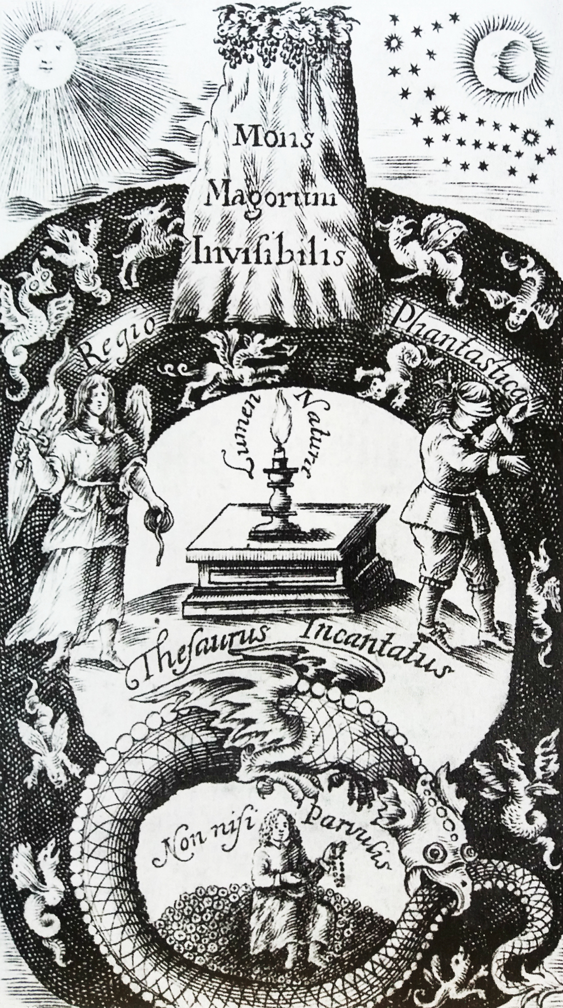 The Invisible Mountain of the Magi with hidden alchemical treasure. The Holy Mountain, Mountain of the inner world in Thomas Vaughan’s Lumen de Lumine (1693). Ilustracja w: Alexander Roob Alchemy and Mysticism: The Hermetic Museum (1997)