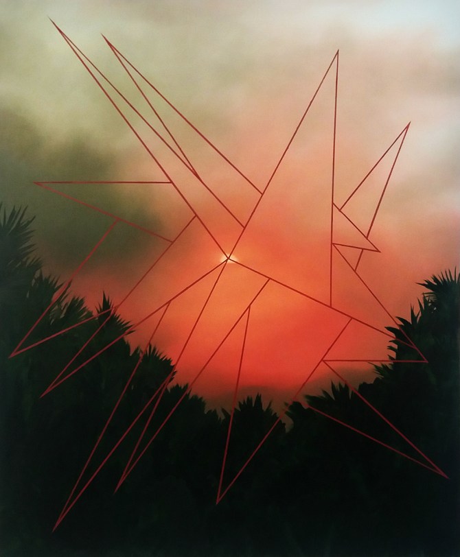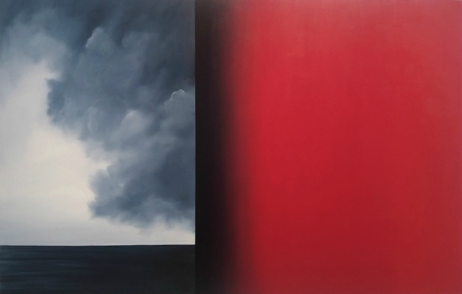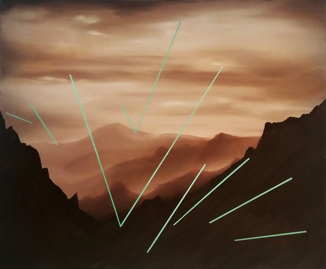 Łukasz Patelczyk „Reminiscencja dobrego spaceru”, 120×100 cm, olej na płótnie, 2018. Wystawa „Signs in the Sky”, Galeria Platan. Budapeszt 2018