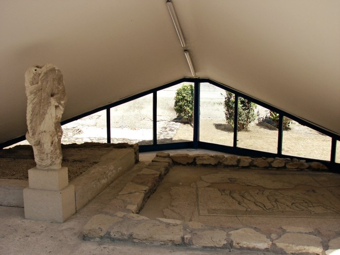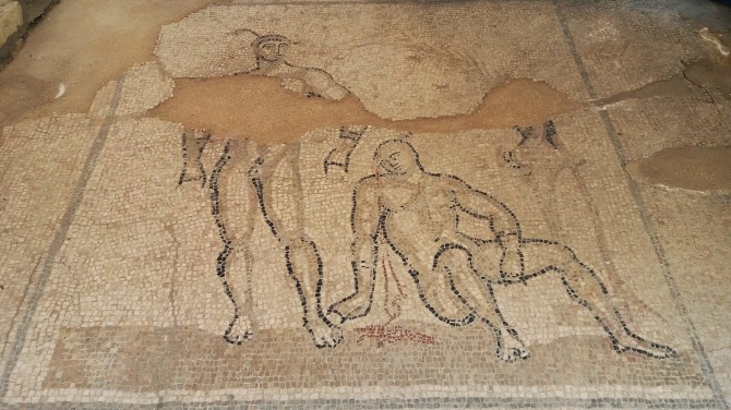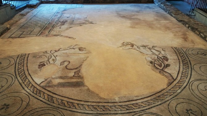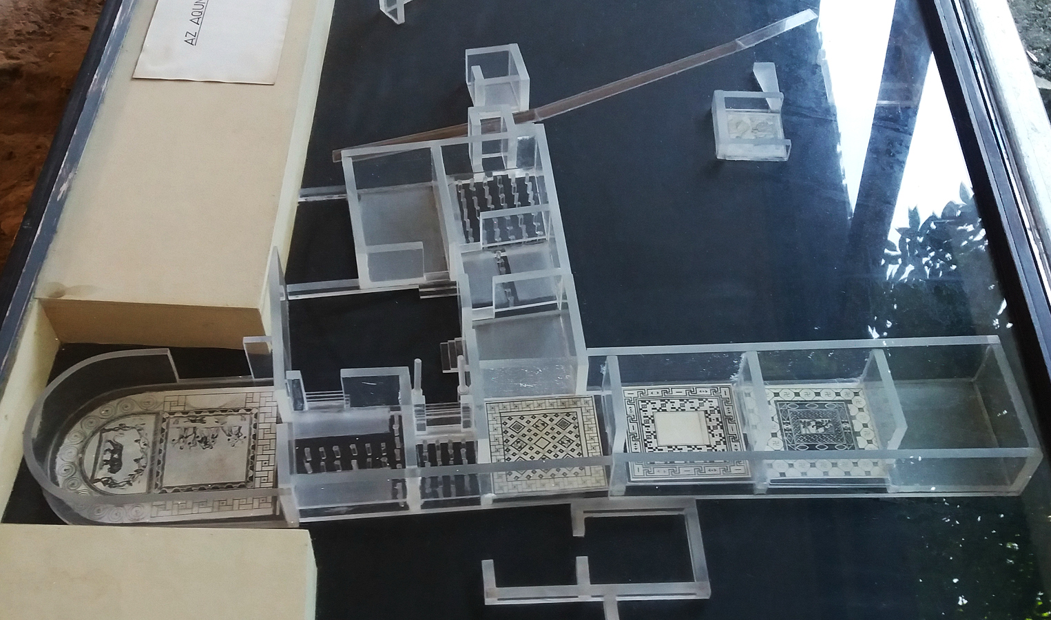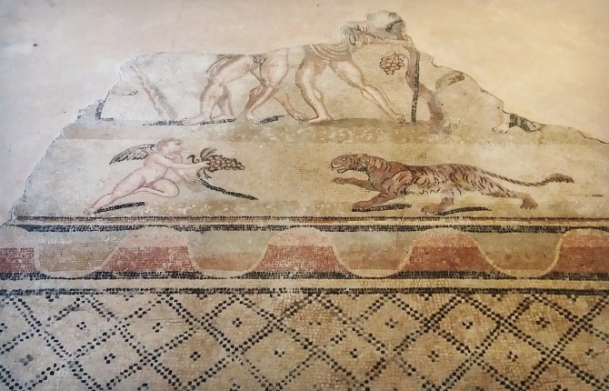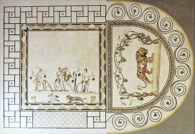 Hercules Villa, the luxurious house of a high ranked Roman citizen, build in 2nd century AD among other villas, baths and temples close to the military base Aquincum („rich in waters”). This capital of the Roman province of Pannonia had up to 40 000 inhabitants (Marcus Aurelius wrote some of his Stoic Meditations here). The ancient ruins can be spotted all over the 3rd district in Budapest, between blocks of flats, parks, or – underneath the school – like the Hercules Villa, decorated with mosaic presenting fighting boxers or Hercules and Nessos the centaur. The mosaic on the tablinum floor depicts a wine harvest procession (thiasus) held in honour of Dionysus, with drunken Hercules and the feasters, and Amor offering grapes to an approaching tigress – frequent animal companion of the god of wine.