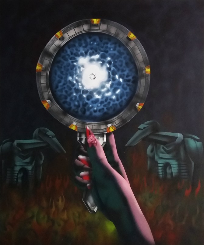 Botond Keresztesi “Stargate mirror”, 120×100 cm, akryl na płótnie, 2018. Wystawa: “LSD – Lex Selfie Drama”, PP Center. Budapeszt 2018
