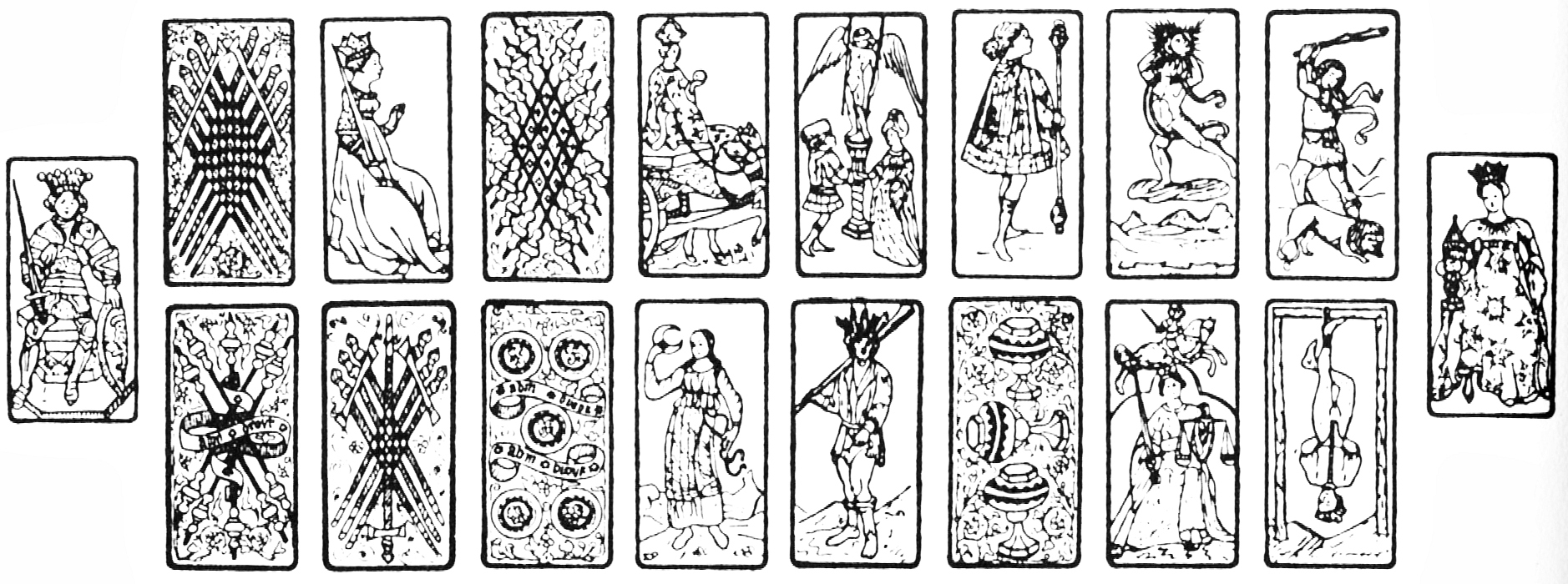 The wind, or waves? The lines drawn at the bottom of the card could indicate that the great tide is already engulfing the top of the tree and all vegetation is being dissolved in a swaying of algae and tentacles. This is the answer to the choice of the man who does not choose: now he does indeed have the sea, he plunges into it headlong, swaying among the corals of the depths, Hanged by his feet in the sargassoes that half-submerged beneath the ocean’s opaque surface, and his green seaweed hair brushes the steep ocean beds. (Is this then the very card that Madame Sosostris, famous clairvoyante but not very reliable as to nomenclature, in prophesying the private and general destiny of the distinguished Lloyds employee, described as a drowned Phoenician sailor?)