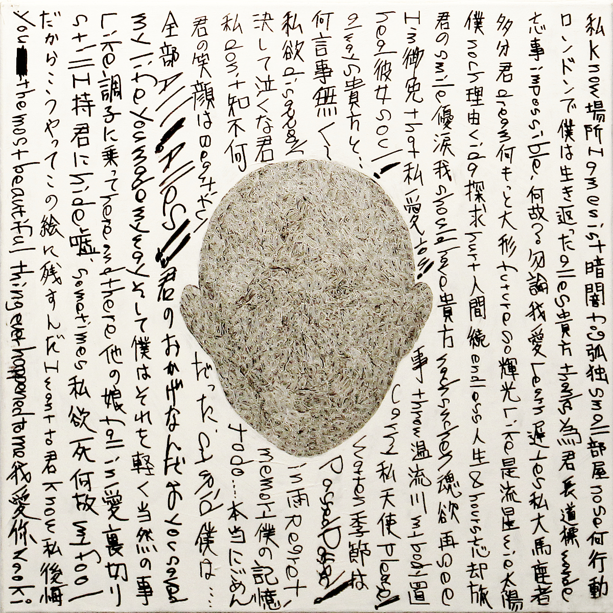 Naoki Fuku „Testament dla mojej utraconej tożsamości” (“A will for my lost identity”), akryl, olej, kaligrafia na płótnie, 80×80 cm, 2010, Léna & Roselli Gallery (Art Market Budapest). Budapeszt 2016