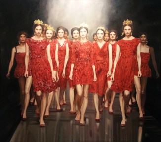 Attila Adorján „Red Marchers on the Catwalk”, 180×200 cm, olej na płótnie, 2017. Ari Kupsus Gallery (Art Market Budapest). Budapeszt 2017