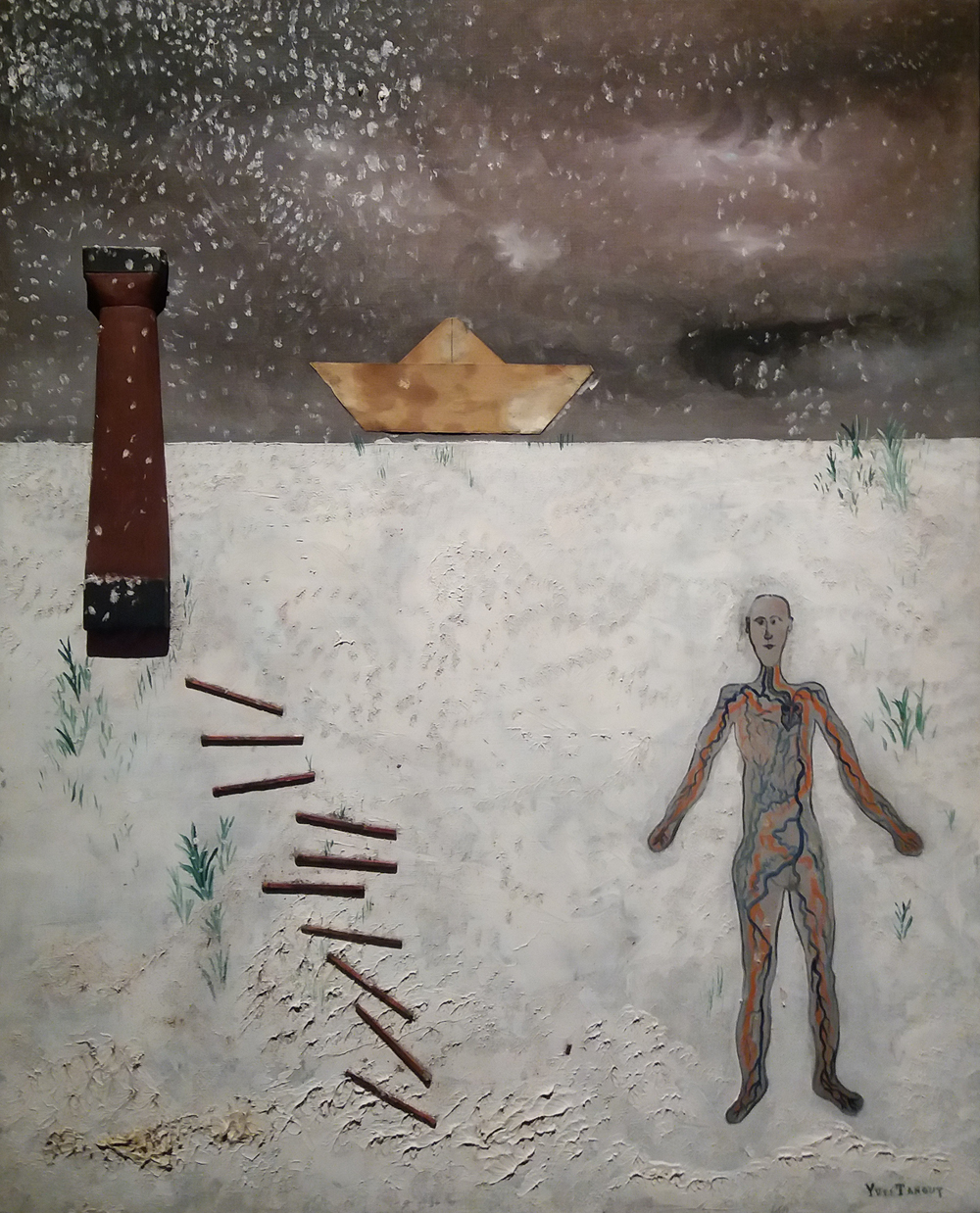 Yves Tanguy „Lighthouse”, kolaż, zapałki, papier i olej na płótnie, 61×50 cm, 1926. Wystawa „The Surrealist Movement from Dalí to Magritte – Crisis and Rebirth in 1929”, Węgierska Galeria Narodowa (Magyar Nemzeti Galéria). Budapeszt 2019